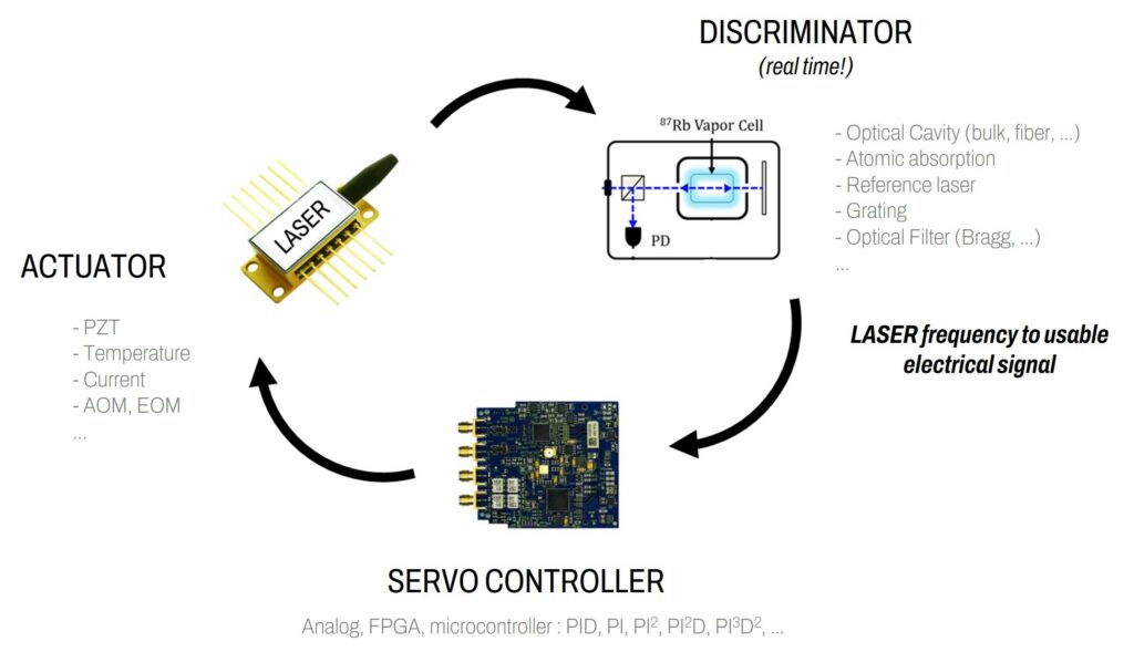 The frequency stabilization of continuous-wave lasers is an active process that aims to reduce the frequency fluctuations at different time scales. This process needs only 3 major elements that are